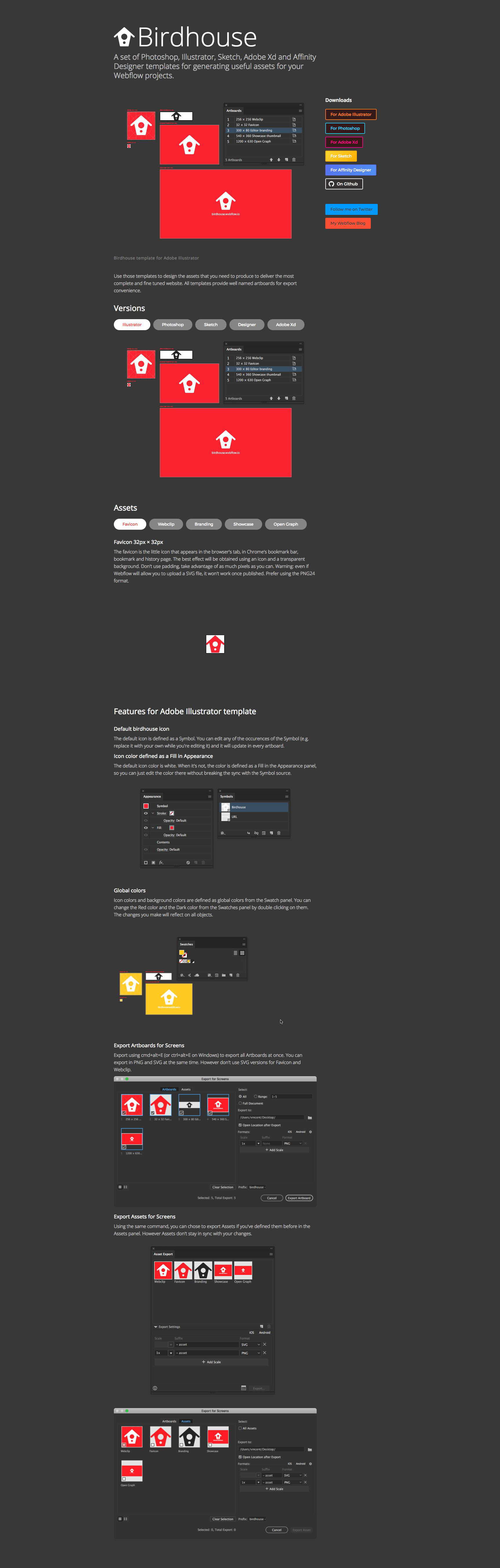 A mini site for a set of Photoshop, Illustrator, Sketch, Adobe Xd and Affinity Designer templates to generate useful assets for your Webflow projects.